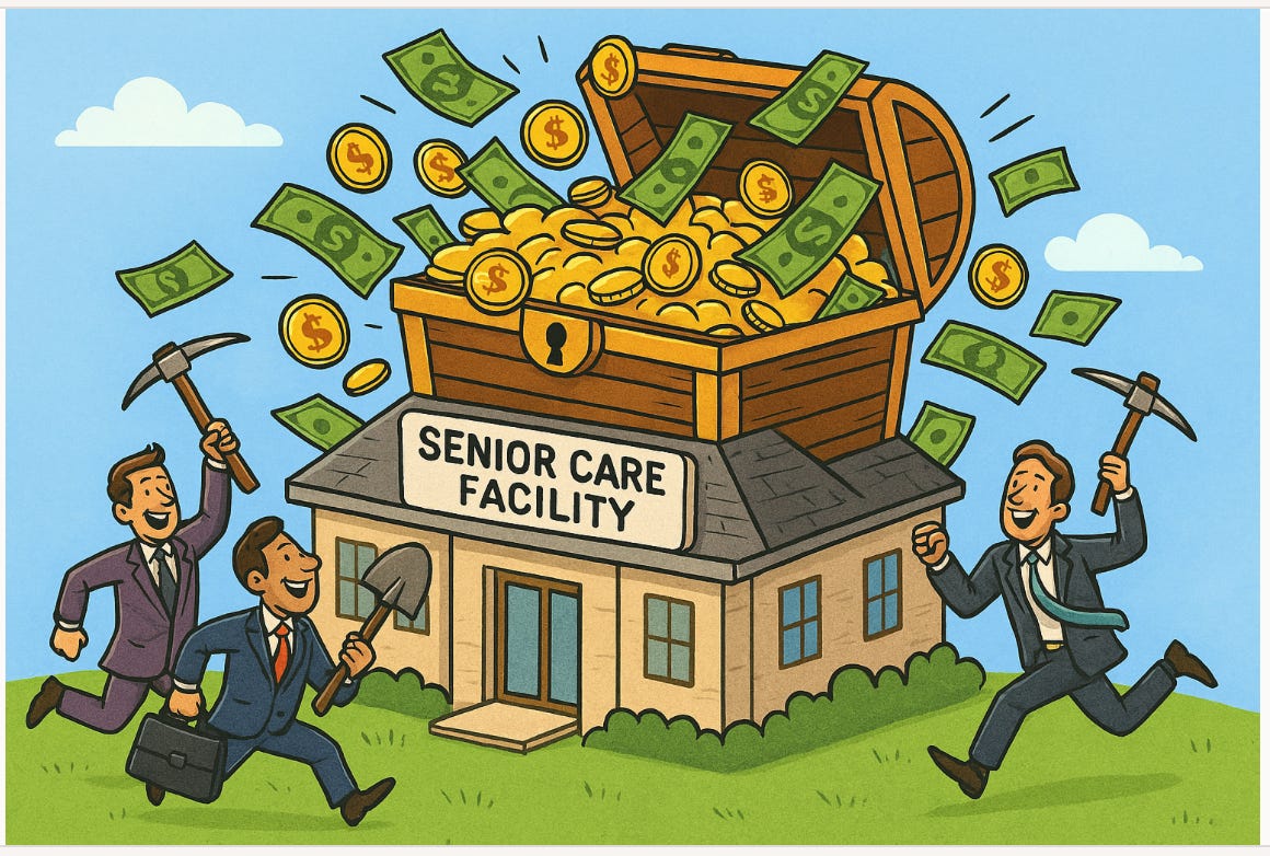 There is no other business sector in America that can legally operate like this. That explains why there is a quiet rush by private equity and REIT organizations to move money into senior care facilities. It is hard to top the advantage of housing a constituency that has no voice or political power, combined with guaranteed government revenue as your income stream.